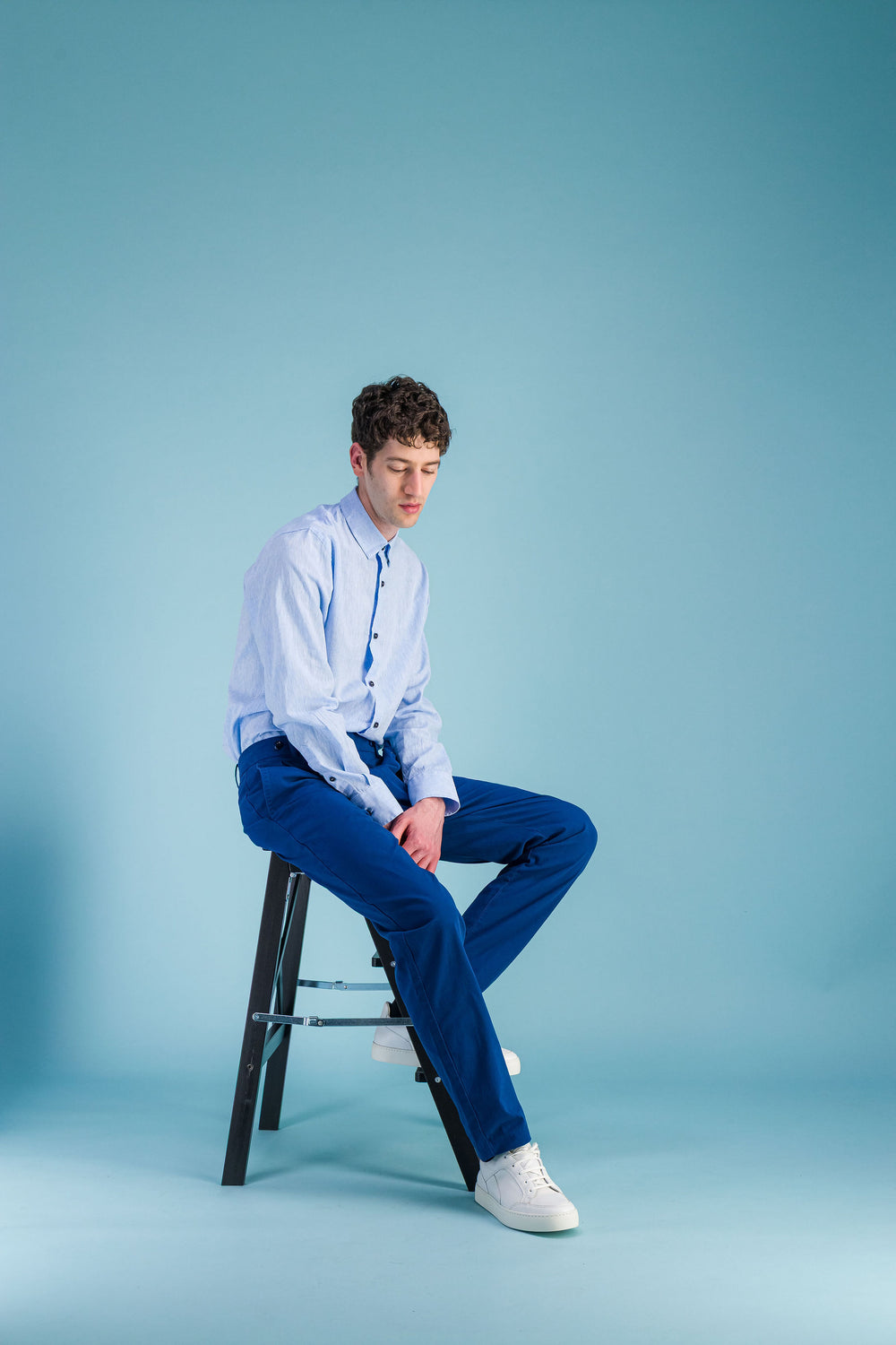Manches longues, col français boutonné, boutons de col sous patte, fit ajusté.