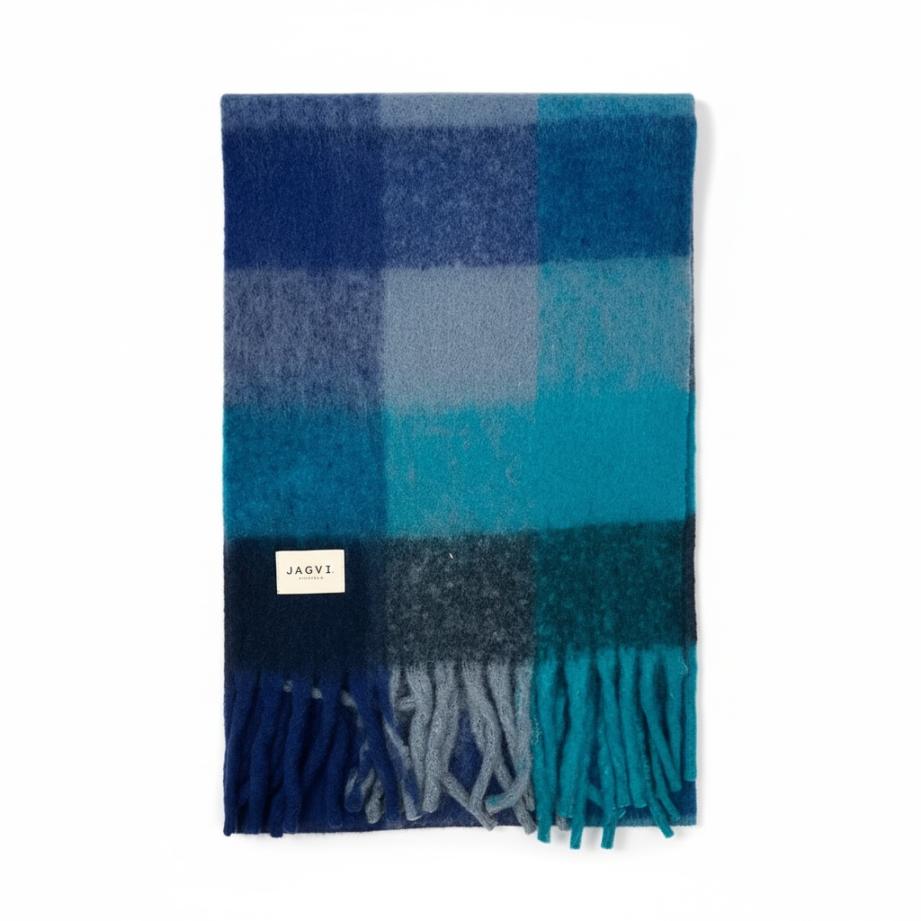 Au toucher et à l'aspect "douillet", cette écharpe JAGVI. Rive Gauche tissée au Japon à la texture laineuse à carreaux bleus qui vous apportera la chaleur et un côté décontracté.