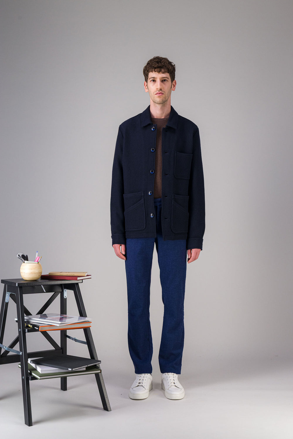 Couleur marine, fermeture boutonnée, 3 poches devant, col veste. Doublure intérieure ton sur ton.