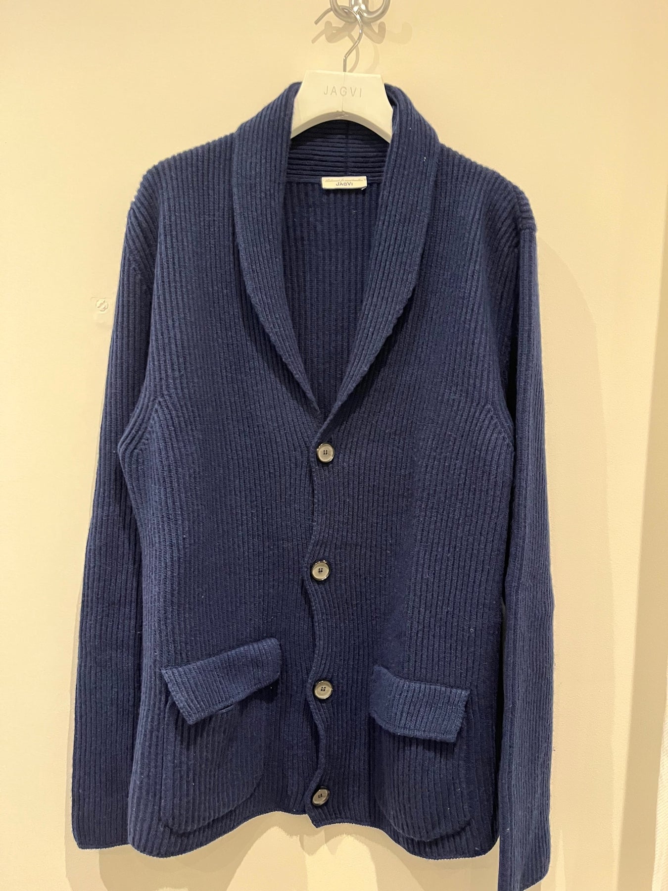 Couleur bleu foncé , avec col châle, manches longues, finitions bord-côtes. Jagvi Rive Gauche réalise un pull chaud col châle à boutons pour l'automne hiver dans une laine mérinos recyclée.