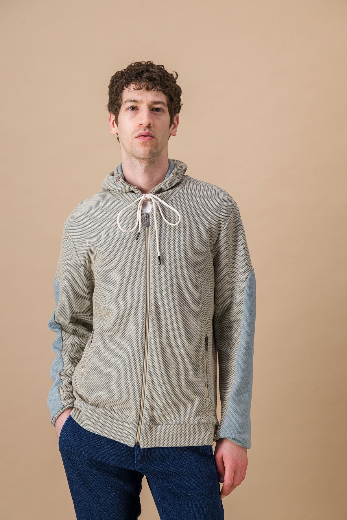 Brown, contrasting patch pockets, long sleeves, slim fit, front zip pockets.